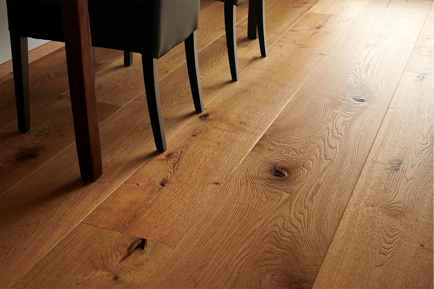 Colorazioni non omogenee, venature in rilievo e nodi vissuti ripristinati a stucco: pregiate lavorazioni che esaltano le caratteristiche di ogni doga di Rovere Europeo.