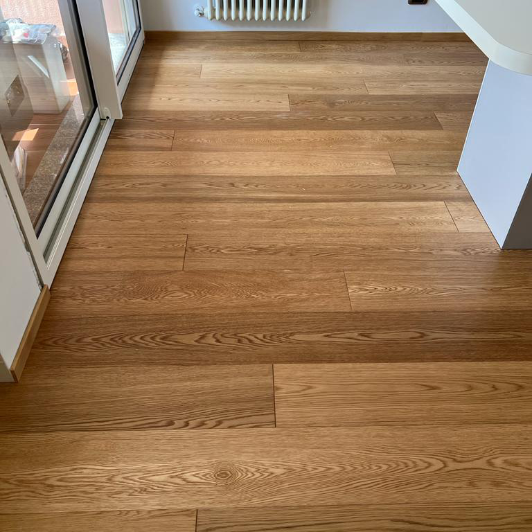 Un pavimento prefinito disponibile in Rovere caratterizzato dalla finitura effetto cera che non richiede la cura tipica di un parquet cerato.