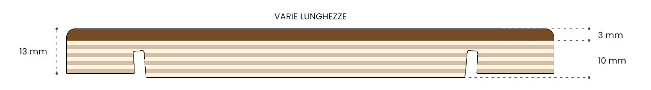 Le doghe sono composte da 3 - 4 mm di vero legno nobile incollato a 10 - 12 mm di multistrato di betulla fenolica certificata.