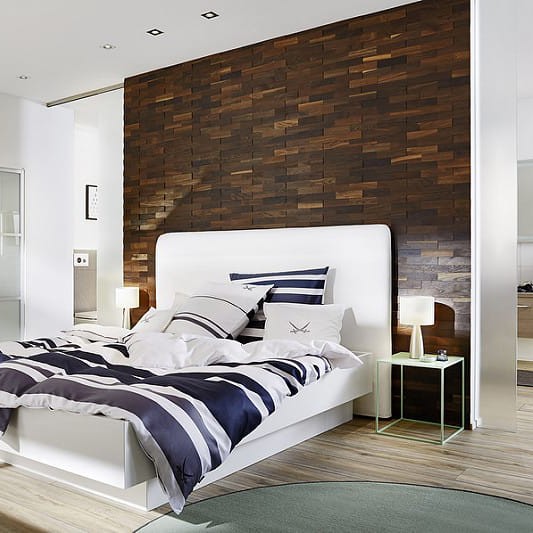 I rivestimenti murali in legno di rovere, dal color tabacco scuro, vanno ad esaltare la bellezza e il fascino di un arredamento moderno. Sono pertanto la scelta più consigliabile anche per la camera da letto moderna, perfetti soprattutto per divenire lo splendido sfondo della parete posteriore del letto. Design raffinato ed effetto elegante sono due delle caratteristiche di questa parete presente in foto.
